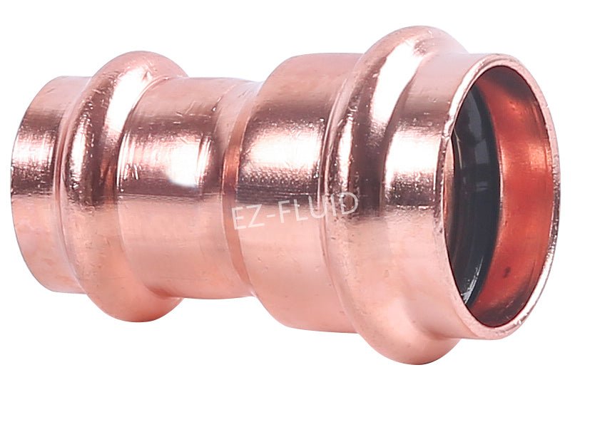 The EZ-Fluid 1-1/4" X 1" Press X Press COPPER PRESS COUPLING REDUCER allows smooth pipe size transitions in press systems, optimizing water flow.