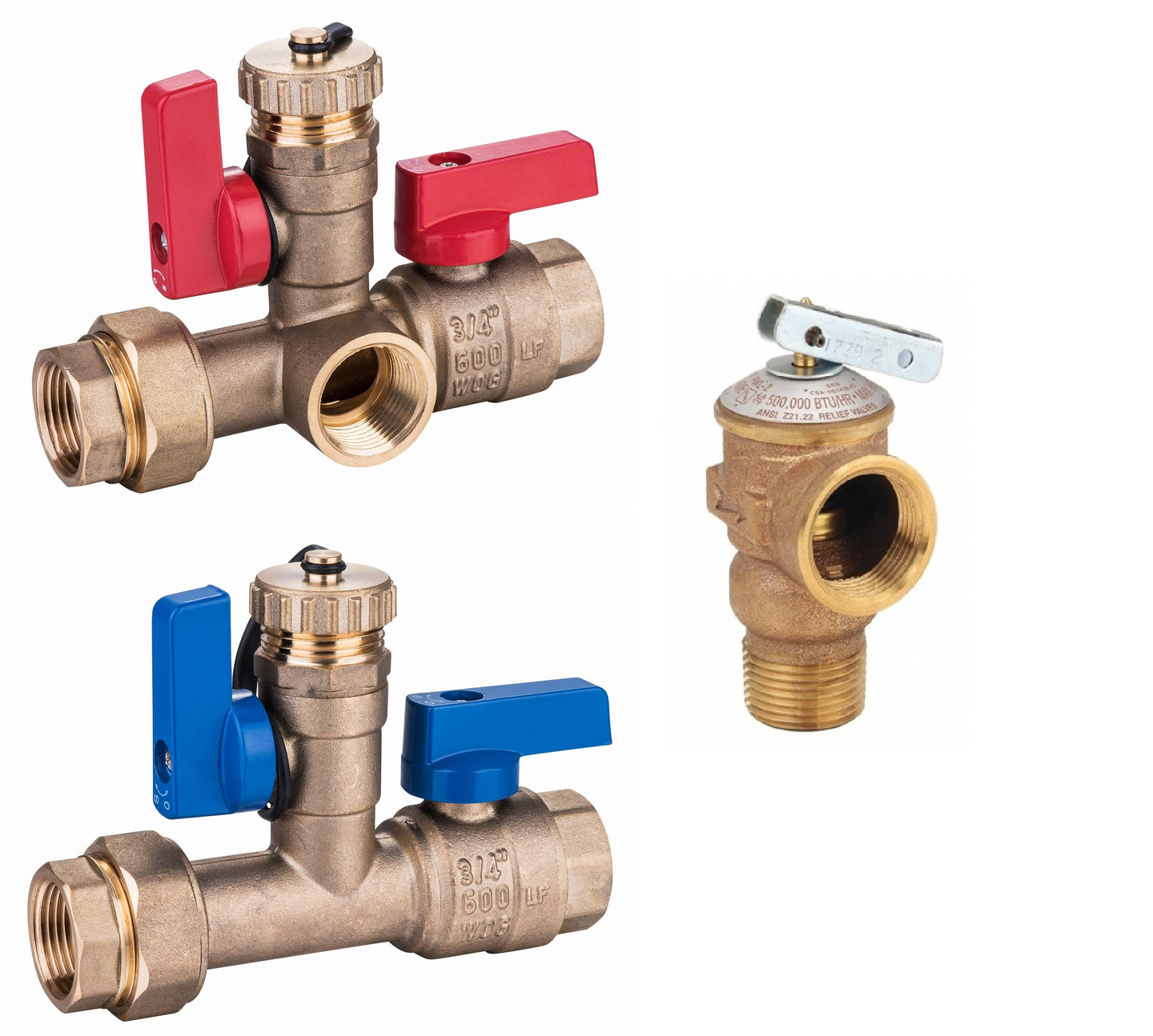 EZ-Fluid 3/4" FIP Union x 3/4" FIP, Tankless Water Heater Service Valve Kit (Cold & Hot) , Includes 3/4" IPS Pressure Relief Valve Brass BRASS