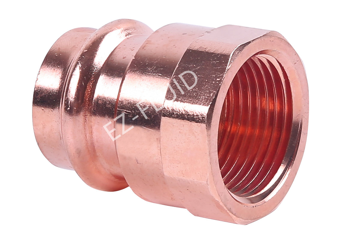 The EZ-Fluid 1-1/2" X 1-1/4" Press X FPT COPPER PRESS FEMALE ADAPTER connects press fittings to female-threaded components, ensuring a strong seal.