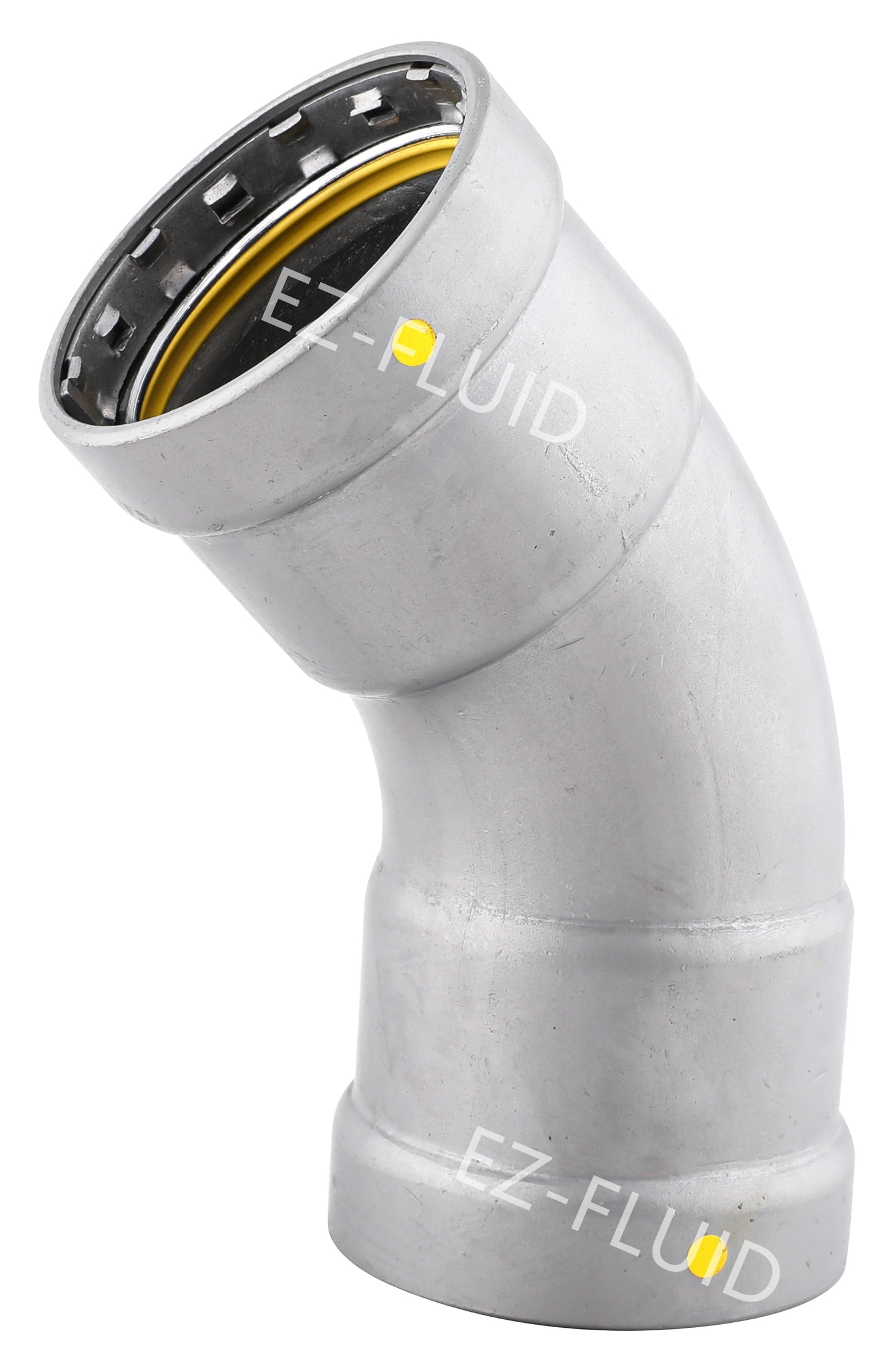 EZ-Fluid 2" Carbon Steel Press Mega Type PressG 45 Degree ELBOW (HNBR) For Gas is a premium plumbing fitting designed for durability and secure connections. It meets industry standards and is ideal for professional plumbing installations.